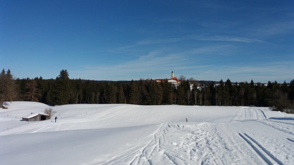 Langlaufrunde vom Freibad Eichmühle in Tölz zum Kloster Reutberg bei tollem Schnee und traumhaftem Wetter. Kloster Reutberg