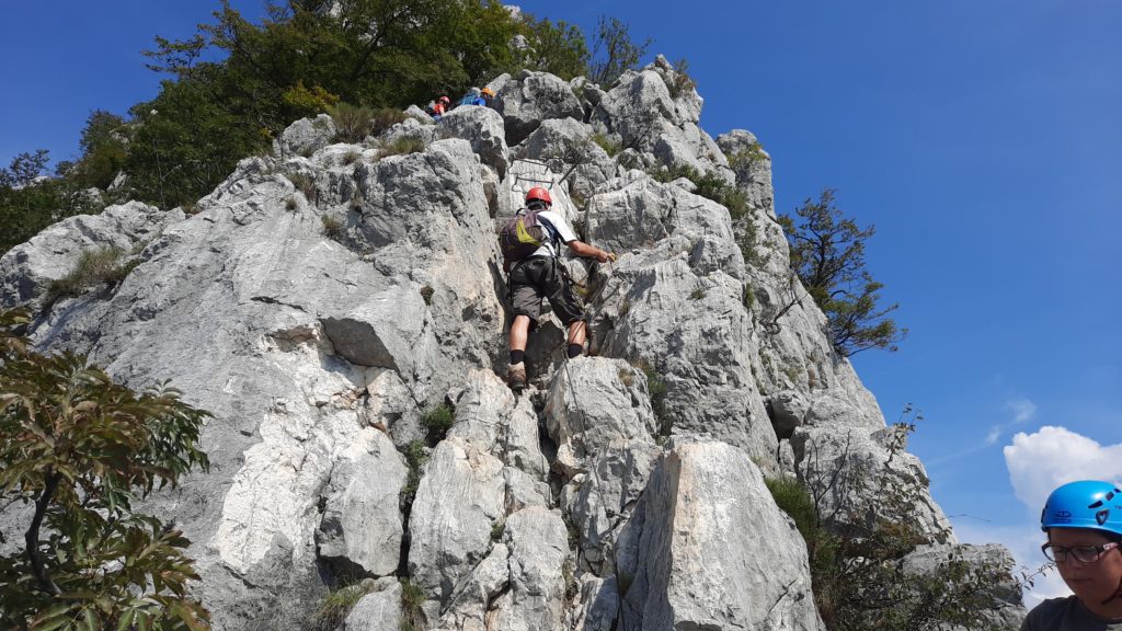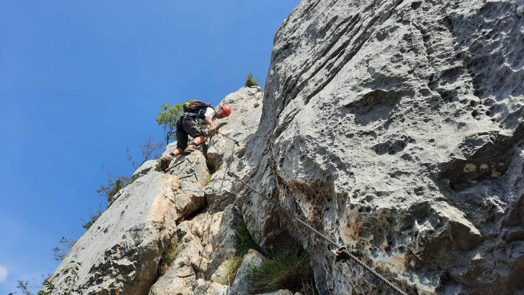 Der Klettersteigklassiker am Gardasee. Parken in Biacesa. Dann erst mal ca. 1,5 h Zustieg um den Berg herum, bis der Fausto Susatti losgeht. Sehr sonnig und heiß! Querung über den Foletti-Klettersteig. Man kommt an einem kleinen Refugion mit schöner Aussicht raus. Der Abstieg ist dann sehr steil über teils betonierte Rampen.